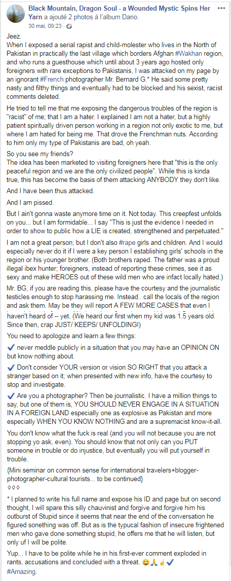 One more, one less... Where is the problem? Ramla Akhtar, aka Rmala Aalam (RA), a resident of Hussaini (Gojal), permanently creates fake news. See § 4.1. Censure and cooking contradictions, fake news building. I will not spend my life debunking this psychedelic case. It is useless. I wrote my extensive paper and addressed all the main issues. Game over. Now, I make sure it goes « to whom it may concern » and that's all. But I will answer because this is an extremely unusual troll. I am in Nantes, Bretagne, not in Paris, not in Pakistan. I am not the conductor of a fantastic symphony for a contract less faded starlet starving for recognition. As I said, the only thing I did was to publish an article, actually more a kind of audit report - "Report of a French traveler about a domestic hate speech against the Wakhi minority of Chapursan Valley and its male international guests - credibility assessment of an alleged sexual conspiracy against local women and foreign female visitors – concerns about an emerging external extremism" (Note: in this article, all paragraph numbers will refer to this publication). The only thing I am doing, now, is to make sure it is actually shared.